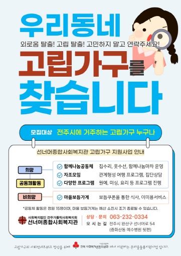 [한국제일신문, 김성관기자] 전주시 선너머종합사회복지관은 전주시에 거주하는 고립가구의 사회적 고립 해소와 지역사회 관계망 형성을 지원하기 위한 ‘2026년 고립가구 지원사업’ 참여자를 모집한다고 6일 밝혔다.