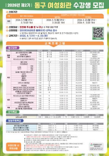 [한국제일신문, 김성옥기자] 인천 동구는 오는 3월 9일~4월 3일까지‘2026년 제2기 동구 여성회관’ 수강생을 모집한다고 밝혔다.