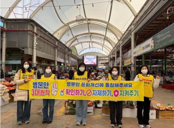 특히 설 연휴를 앞둔 2월 11일 광양읍 5일시장 일원에서 보건소 직원 5명이 참여해 병문안 문화개선 캠페인을 펼치며, 시민들에게 병문안 문화 개선 3대 원칙인 ▲확인하기(병문안 가능 시간과 장소 확인) ▲자제하기(환자를 위해 병실 면회 자제) ▲지켜주기(손 위생, 기침 예절 등 예방수칙 준수)의 실천을 안내했다.