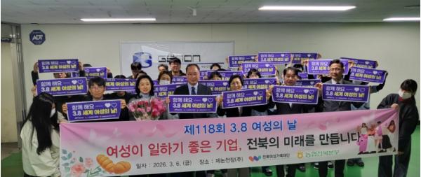 [한국제일신문, 윤진성기자] 전북특별자치도는 6일 제118회 세계 여성의 날을 맞아 전북여성가족재단, 농협중앙회 전북본부와 함께 여성친화기업 제논전장㈜를 방문해 여성 근로자들을 격려하고 성평등 조직문화 확산을 위한 기념행사를 개최했다.