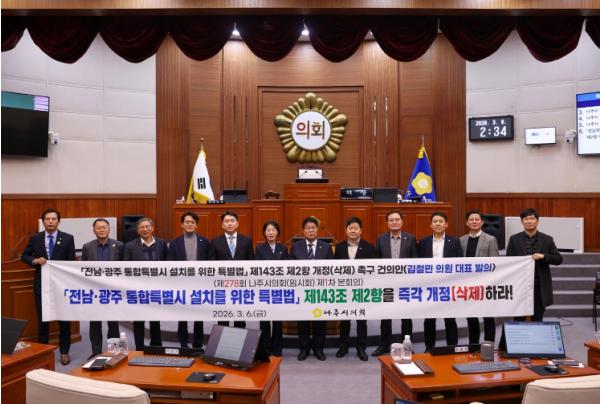 [한국제일신문, 김성옥기자] 나주시의회는 3월 6일 제278회 임시회 제1차 본회의를 열고 ''전남광주통합특별시 설치를 위한 특별법' 제143조 제2항 삭제 촉구 건의안'을 채택했다.