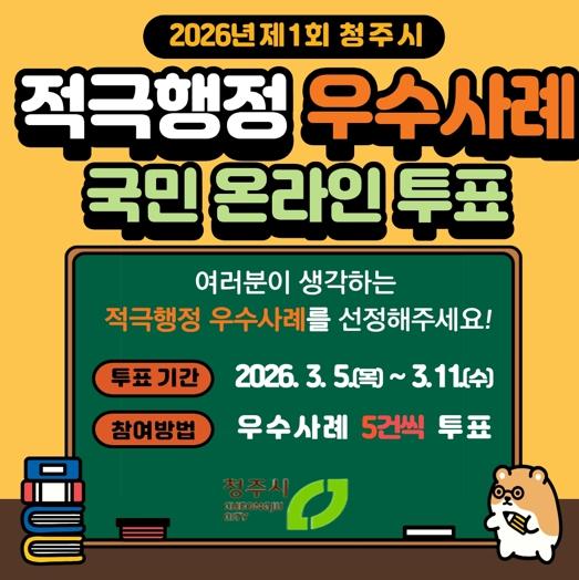 [한국제일신문, 김성옥기자] 청주시는 ‘2026년 제1회 적극행정 우수공무원 선발’ 공모 심사를 위한 시민 투표를 3월 11일까지 진행한다고 7일 밝혔다.