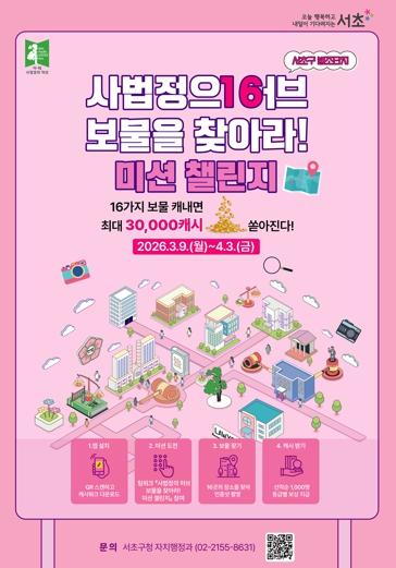 전성수 서초구청장은 “이번 챌린지를 통해 주민들이 사법정의 허브 공간을 자연스럽게 경험하고 일상 속 걷기의 즐거움도 함께 느끼길 바란다”며 “3월 9일 공개되는 16곳의 보물을 직접 찾아보며 미션 성공의 기쁨을 누리길 기대한다”고 말했다.