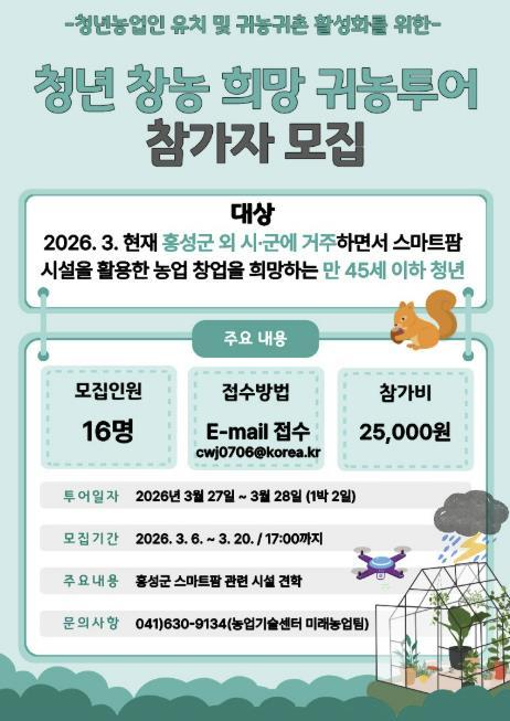 군 관계자는 “이번 프로그램은 미래 농업의 핵심인 청년들에게 홍성군의 스마트팜을 알리고, 안정적인 정착을 돕기 위해 마련했다”며, “홍성군에 우수한 농업 인재들이 모여 꿈을 펼칠 수 있도록 환경 조성에 노력하겠다”고 말했다.