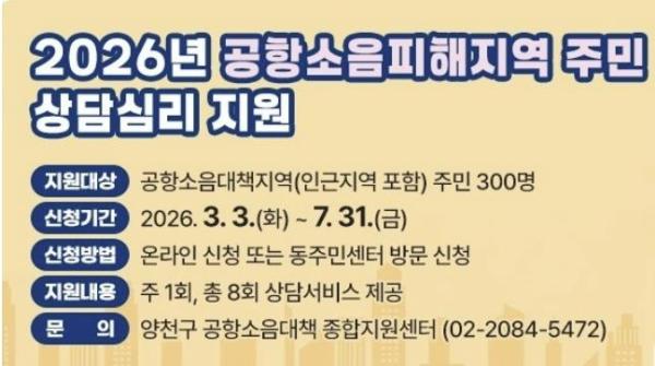 이기재 양천구청장은 “공항소음 피해지역 주민들이 겪는 불편을 조금이라도 덜어드리고 삶의 질을 높이기 위해 실질적인 지원을 지속적으로 확대하고 있다”며 “앞으로도 주민들이 체감할 수 있는 정책을 적극 발굴해 생활 안정에 도움이 되도록 최선을 다하겠다”고 말했다.