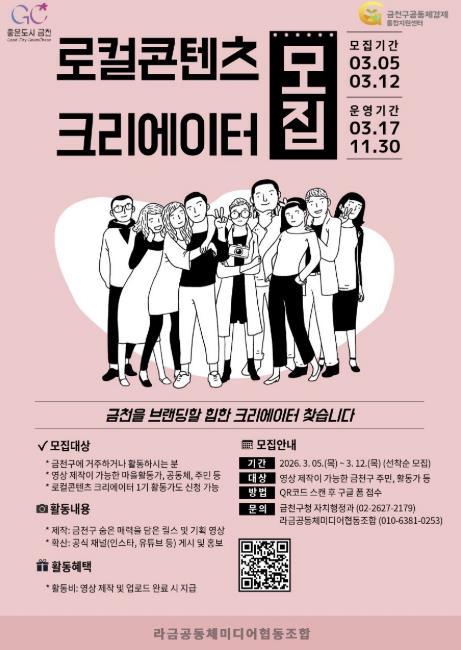구 관계자는 “주민의 아이디어와 재능이 더해질 때 지역은 더욱 생동감 있게 변화한다”라며 “이번 사업이 금천구의 새로운 가능성을 발견하고 긍정적인 지역 이미지를 확산하는 계기가 되길 기대한다”라고 밝혔다.