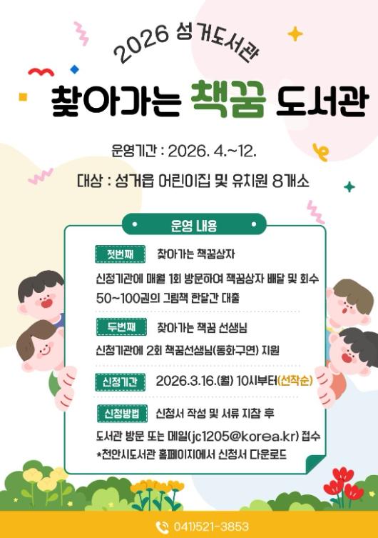 [한국제일신문, 김성옥기자] 천안시 성거도서관은 내달부터 ‘찾아가는 책꿈 도서관’을 운영한다고 9일 밝혔다.