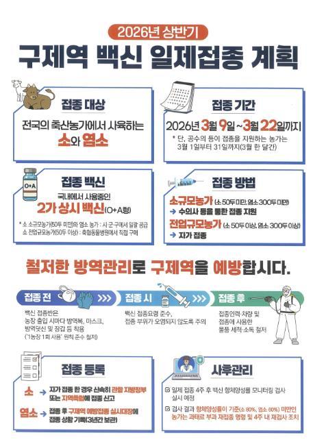 [한국제일신문, 김성옥기자] 홍천군은 구제역 유입 방지와 완전 차단을 위해 상반기 구제역 일제 백신접종을 실시한다. 대상은 1,001 농가 36,830두(소 928 농가 33,566두, 염소 73 농가 3,264두) 사육 농가이다.