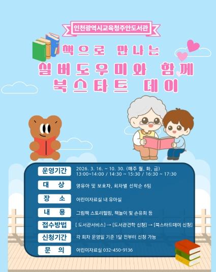 [한국제일신문, 김성옥기자] 인천광역시교육청주안도서관은 오는 3월 16일부터 10월 30일까지 영유아 및 보호자를 대상으로 ‘책으로 만나는 실버도우미와 함께 북스타트 데이’를 운영한다.