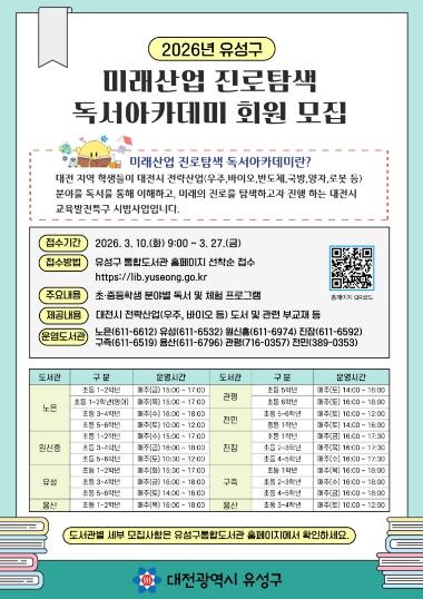 [한국제일신문, 김성옥기자] 대전 유성구는 4월부터 12월까지 관내 8개 공공도서관에서 초·중학생을 대상으로 ‘2026년 미래산업 진로 탐색 독서아카데미’를 운영한다.