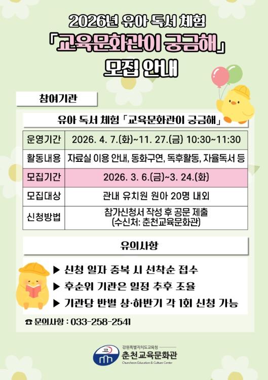 춘천교육문화관 2026년 유아 독서 체험‘교육문화관이 궁금해’ 운영