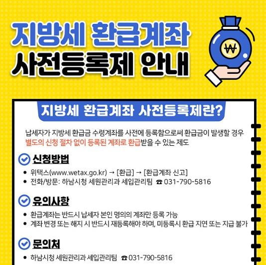 [한국제일신문, 김성옥기자] 하남시는 납세자에게 지방세 환급금(더 낸 세금)을 보다 신속하고 편리하게 지급하기 위해 ‘지방세 환급계좌 사전등록제’를 적극 운영한다고 밝혔다.