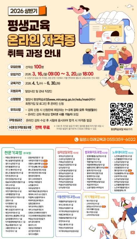 [한국제일신문, 김성옥기자] 경남 밀양시는 시민의 직무역량 강화와 자기계발 지원을 위해 ‘2026년 상반기 평생교육 온라인 자격증 취득 과정’ 수강생을 오는 16일부터 모집한다.