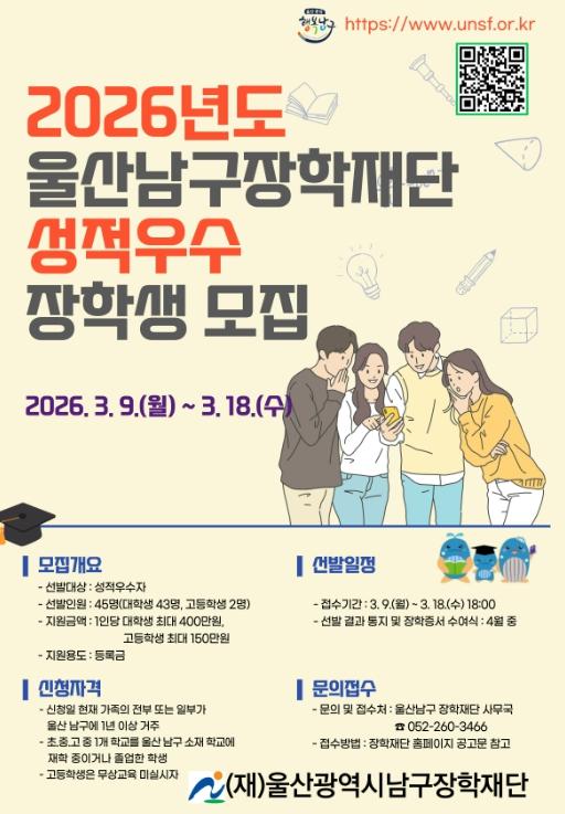 (재)울산광역시남구장학재단은 지역의 우수 인재 발굴과 교육지원을 위해 2026년도 성적우수 장학생 45명을 선발한다.