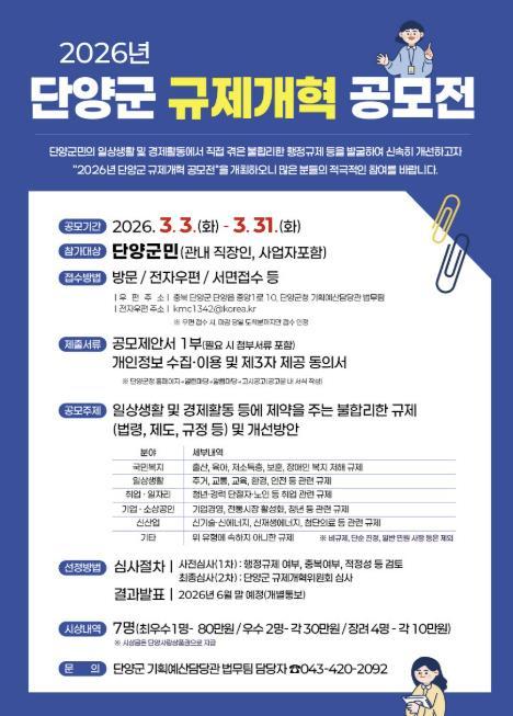 [한국제일신문, 김성옥기자] 단양군이 군민의 일상생활과 경제활동에서 체감하는 불합리한 행정규제를 발굴하고 개선하기 위해 ‘2026년 단양군 규제개혁 공모전’을 개최한다.