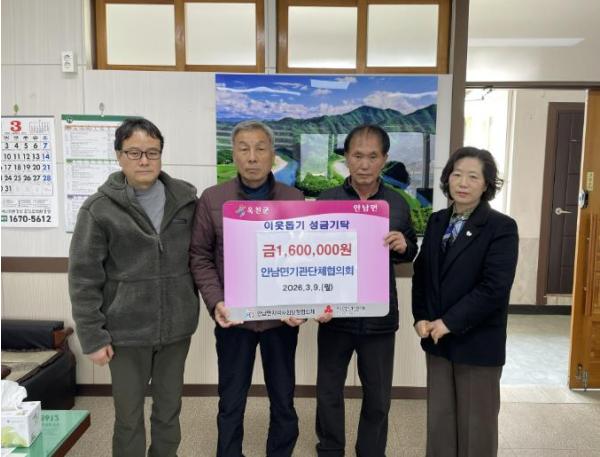 안남면기관단체협의회는 이웃사랑과 나눔 실천의 일환으로 안남면 지역사회보장협의체, 농민회, 배바우도서관, 씨앗기금에 총 160만 원의 성금을 기탁했다. 이번 기탁은 안남면 기관단체장회의를 계기로 마련됐으며 안남면 지역사회보장협의체 50만 원, 농민회 60만 원, 배바우도서관 30만 원, 씨앗기금 20만 원이 각각 전달됐다.