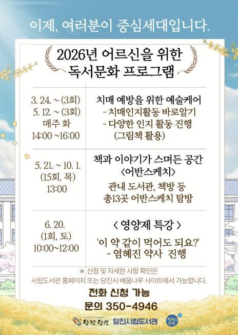[한국제일신문, 김성옥기자] 당진시는 어르신들이 책을 매개로 다양한 문화 활동을 경험하며 건강과 삶의 질을 높이기 위해 시립송악도서관에서 어르신 대상 독서문화 프로그램을 운영한다고 10일 밝혔다.