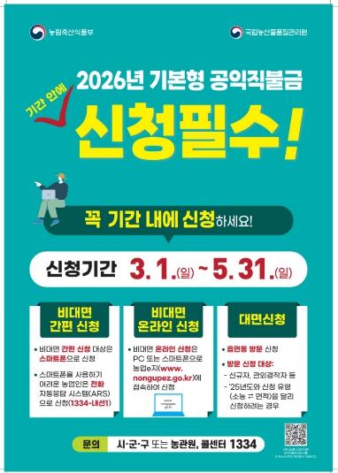 [한국제일신문, 김성옥기자] 문경시는 농업인의 소득 안정을 위한 ‘2026년 기본형 공익직접지불금’신청을 3월 1일부터 5월 31일까지 농지 소재지 읍·면·동 행정복지센터 방문 또는 스마트폰, 인터넷, ARS를 통해 받는다.
