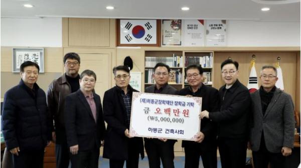 (재)하동군장학재단은 지난 9일 군수 집무실에서 하동군 건축사회(회장 이정필)가 지역 발전과 인재 양성을 위한 장학기금 500만 원을 전달했다고 밝혔다.