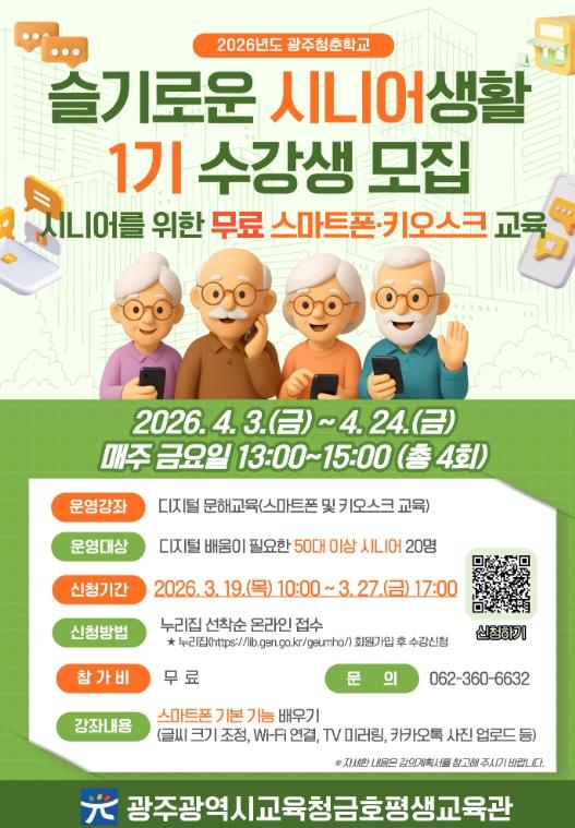 [한국제일신문, 윤진성기자] 광주시교육청금호평생교육관은 오는 4월 3일부터 7월 31일까지 50대 이상 시니어를 대상으로 디지털 역량 강화 프로그램인 ‘2026 슬기로운 시니어생활’을 운영한다.