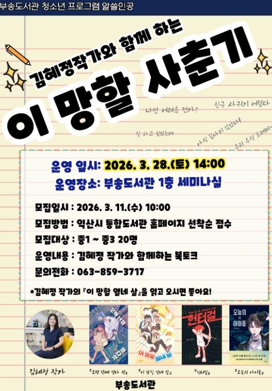 익산 부송도서관, 김혜정 작가 초청 청소년 북토크