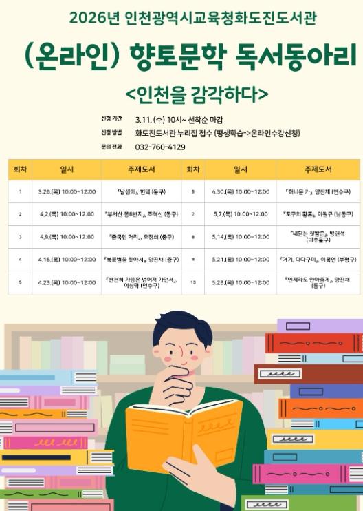 [한국제일신문, 김성옥기자] 인천광역시교육청화도진도서관은 인천 시민의 지역적 정체성과 문학적 감수성을 함양하기 위하여, 오는 11일부터 향토문학 독서동아리 ‘인천을 감각하다’ 참여자를 모집한다.