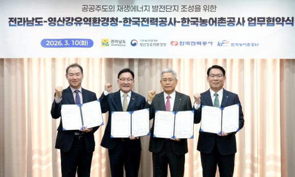 [한국제일신문, 윤진성기자] 전라남도는 10일 한국전력공사 회의실에서 한국전력, 한국농어촌공사, 영산강유역환경청과 공공 주도 재생에너지 발전단지 조성과 안정적 전력 공급을 위한 업무협약을 했다.
