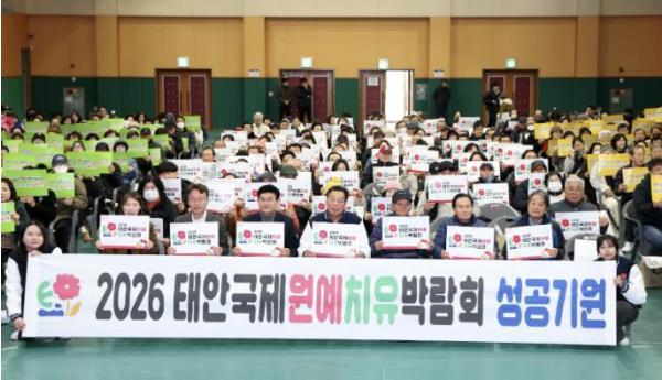 [한국제일신문, 김성옥기자] 태안군이 범군민지원협의회와 함께 ‘2026년 태안국제원예치유박람회’의 성공적인 개최를 위해 지역 주민들의 자발적인 참여를 이끌어내는 대규모 범군민 다짐대회를 개최하며 민관 협력 기반의 강력한 흥행몰이에 나선다.