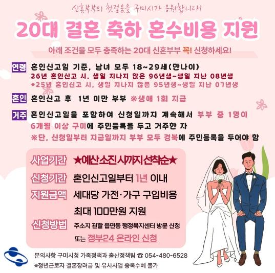 예식 이후 초기 정착을 위한 지원도 병행한다. ‘청년근로자 결혼장려금 지원’ 사업을 통해 25년 이후 혼인신고를 한 구미 거주·근로 청년 400가구에 카드형 구미사랑상품권 100만 원을 지급한다. 경제적 기반이 상대적으로 취약한 20대를 위한 맞춤형 정책도 마련됐다. ‘20대 결혼축하 혼수비용 지원’ 사업은 혼인신고일 기준 부부 모두 20대이면서 혼인신고 후 1년이 지나지 않은 신혼부부가 대상으로 총 84가구를 선정해 혼수 마련 비용 100만 원을 지원한다.