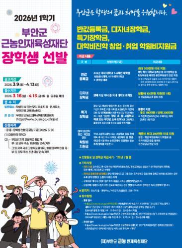 권익현 이사장은 “부안군 근농인재육성재단이 지역 학부모의 교육비 부담을 덜어주고 학생들이 희망과 꿈을 키워나갈 수 있도록 든든한 지원군이 되겠다.”며 “대상 학생들이 빠짐없이 장학금을 받을 수 있도록 적극적인 홍보와 신청 접수에 최선을 다하겠다.”고 밝혔다.