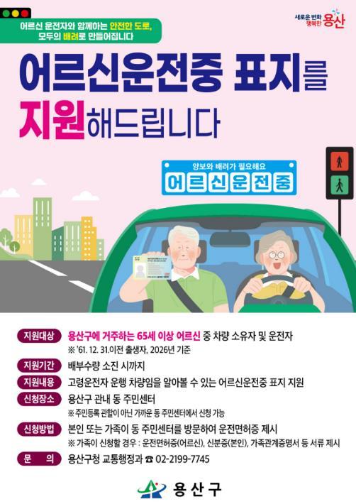 [한국제일신문, 김성옥기자] 서울 용산구는 올해도 고령운전자 안전을 위한 ‘어르신 운전중’ 표지 배부 사업을 추진한다고 밝혔다. 지난해 첫 시행에 이어 2년 연속 진행하는 사업으로, 고령 운전자를 배려하는 안전한 교통 환경을 만들기 위한 취지다.