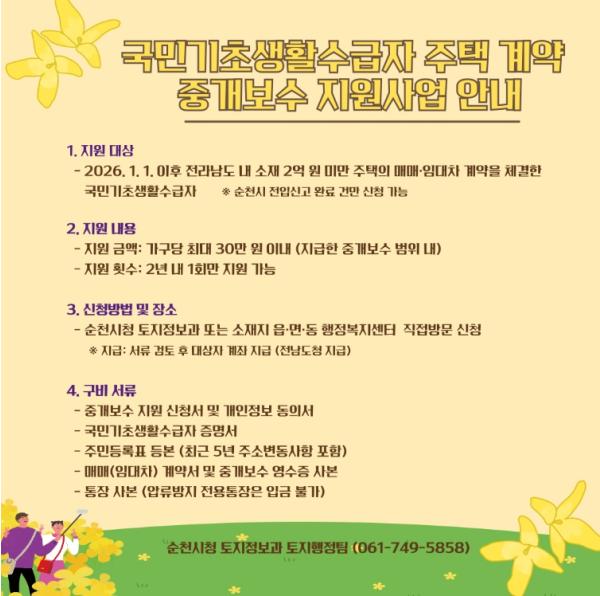 지원을 희망하는 기초수급자는 공인중개사를 통해 주택 계약을 체결하고 중개보수를 지급한 뒤, 주택 소재지 읍·면·동 행정복지센터 또는 순천시 토지정보과에 신청하면 된다.