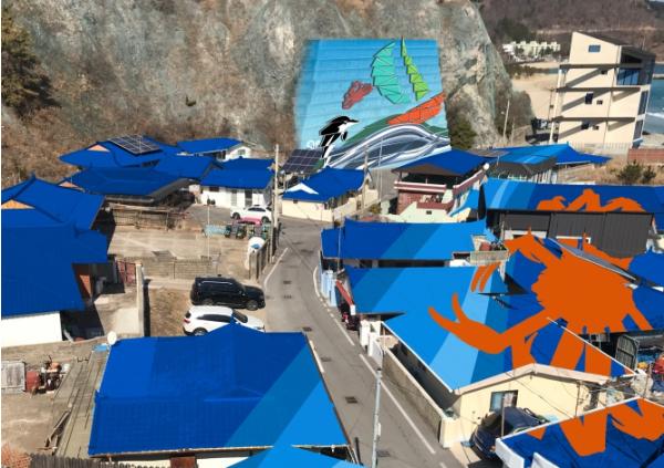 이번 경관사업의 핵심은 마을 지붕들을 하나의 캔버스처럼 활용하는 ‘슈퍼그래픽’ 기법의 도입이다. 관광객들이 등기산 출렁다리에서 마을을 내려다보았을 때 후포를 상징하는 거대한‘게’형상이 입체적으로 드러나도록 설계됐다.