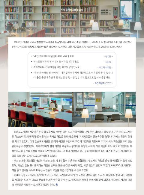 평생교육과 강세영 과장은 ‘전국 도서관을 대표하는 잡지 표지에 장승포도서관이 소개되어 매우 뜻깊게 생각한다’며 앞으로도 시민들이 일상 속에서 편안하게 머물며 책과 문화를 즐길 수 있는 열린 도서관이 되도록 노력하겠다고 밝혔다.
