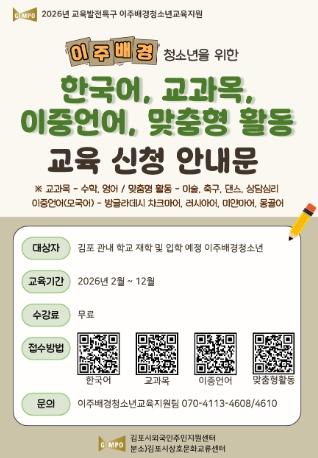 이번 프로그램은 올해 12월까지 김포시 상호문화교류센터를 중심으로 진행되며, 관내 이주배경청소년을 대상으로 한국어 교육과 교과학습 지원 등 맞춤형 교육을 제공한다.