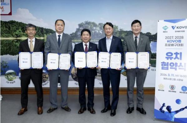 [한국제일신문, 김성옥기자] 한국배구연맹에서 주최하는 KOVO컵 프로배구대회가 2027, 2028년 2년 연속 제천시에서 개최된다. 제천시는 11일 한국배구연맹(KOVO)과 '2027, 2028 제천·KOVO컵 프로배구대회' 유치 협약을 체결하고 대회 개최를 공식 확정했다.