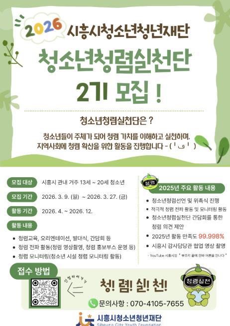 [한국제일신문, 홍영진기자] 시흥시는 시흥시청소년청년재단이 청소년의 청렴 의식을 높이고 지역사회에 청렴 문화를 확산하기 위해 ‘2026년 청소년청렴실천단 2기’ 신규단원을 5명 모집한다고 밝혔다.