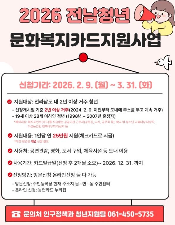 [한국제일신문, 윤진성기자] 무안군은 청년의 문화생활과 자기계발을 지원하기 위해 ‘2026년 전남 청년 문화복지카드 지원사업’ 대상자를 모집하고 있다고 밝혔다.