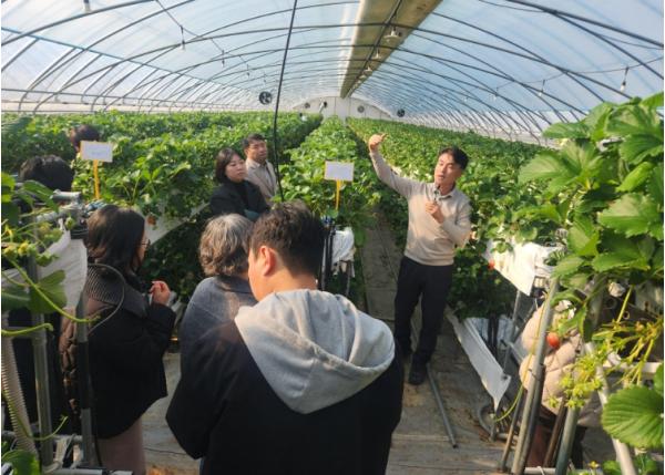 이어 논산시 부적면 소재 딸기 재배농가를 방문해 LED 보광등과 다단재배 시설이 적용된 재배 현장을 직접 견학했다.