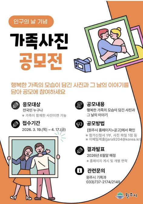 원주시, 인구의 날 기념 '이야기가 있는 가족사진 공모전' 개최