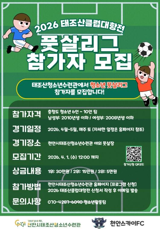 [한국제일신문, 김성옥기자] 천안시청소년재단 산하 천안시태조산청소년수련관은 청소년의 건강한 여가 활동과 스포츠 참여 기회를 확대하기 위해 ‘2026 태조산 클럽대항전 풋살리그’ 참가팀을 모집한다고 20일 밝혔다.