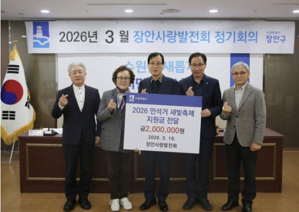 [한국제일신문, 김성옥기자] 수원시 장안구 대표 봉사단체 장안사랑발전회가 지난 19일, '2026 만석거 새빛축제'의 성공적인 개최를 응원하며 지원금 200만원을 전달했다.