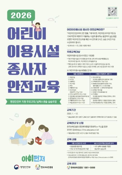 이번 교육은 '어린이 안전관리에 관한 법률'에 따른 법정 의무교육으로, 어린이집·학원·유치원·초등학교 등 13세 미만 어린이가 주로 이용하는 시설의 종사자를 대상으로 한다. 대상 종사자는 응급처치 실습 2시간 이상을 포함해 매년 4시간 이상의 안전교육을 이수해야 한다.