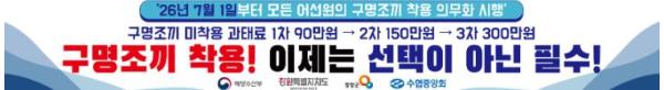 어선 내 구명조끼 미착용 적발 시 관련 법령에 따라 최대 300만 원 이하의 과태료가 부과될 수 있음을 안내하고, 실제 사고 사례를 통해 착용의 중요성을 전파한다.