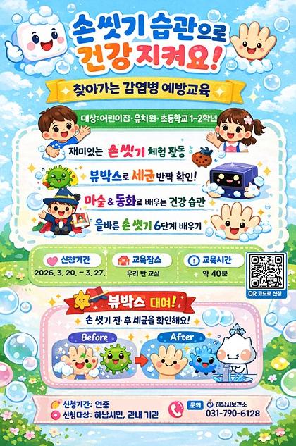 박강용 하남시보건소장은 “개인의 올바른 건강예절 형성은 감염병 질환 감소 및 지역사회 건강 증진에 중요한 역할을 한다”고 강조하며, “앞으로도 다양한 체험형 교육을 통해 시민들의 건강한 생활습관 형성을 적극 지원하겠다”고 말했다.