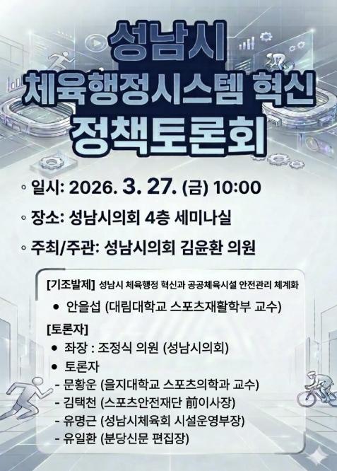 [한국제일신문, 김성옥기자] 성남시의회 김윤환 의원(문화복지체육위원회)은 오는 27일, 성남시 체육행정의 혁신 방향을 모색하기 위한 '성남시 체육행정시스템 혁신 정책토론회'를 개최한다고 밝혔다.
