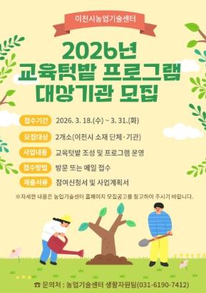 [한국제일신문, 김성옥기자] 이천시는 도시농업 기반 조성 및 활성화를 위해 2026년 도시농업 교육텃밭 프로그램 대상자를 3월 31일까지 모집한다고 밝혔다.