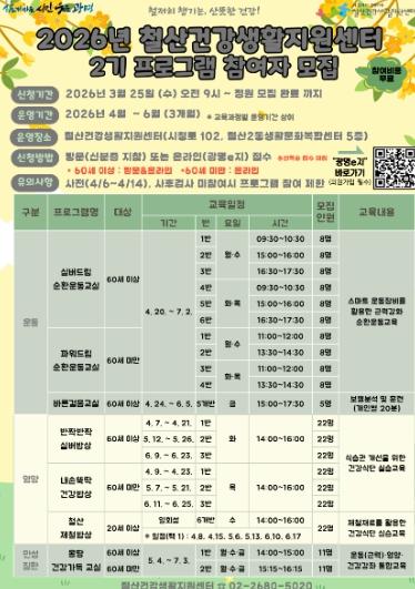[한국제일신문, 홍영진기자] 광명시 보건소 철산건강생활지원센터가 ‘2026년 건강생활 프로그램 2기’ 참가자를 오는 25일 오전 9시부터 선착순 모집한다.