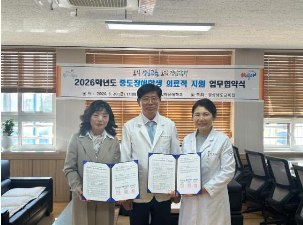 [한국제일신문, 김성옥기자] 경상남도교육청은 20일 오전 11시, 김해은혜학교에서 서종요양병원과 중도장애학생을 위한 맞춤형 의료 지원 업무 협약을 체결했다.