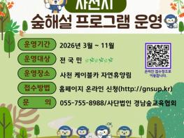 [한국제일신문, 김성옥기자] 사천시는 관내 유아숲체험원 5개소(수양공원, 초전공원, 망산공원, 월성공원, 자연휴양림)와 사천 케이블카 자연휴양림에서 운영하는 2026년 산림교육(유아숲·숲해설) 프로그램 참여자를 모집한다고 22일 밝혔다.